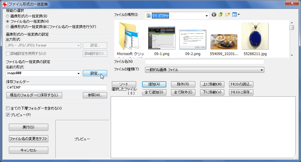次に、ファイル形式を変換したいファイルを選択して、[追加]ボタンをクリックしていきます。 - 保存フォルダは書式設定ではCドライブのTEMPフォルダ内に設定されています。