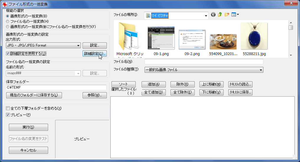 もし、他の場所に保存したい場合は[参照]ボタンをクリックして場所を指定しておいてください。 - 変換したいファイルをすべて選んだら、[実行]ボタンをクリックします。