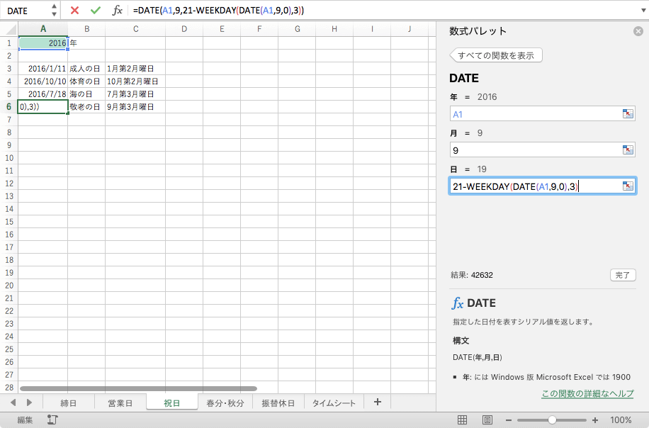 敬老の日の場合、DATE関数の[月]の引数を「9」に指定し、あとは海の日と同様に求めます。