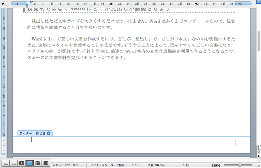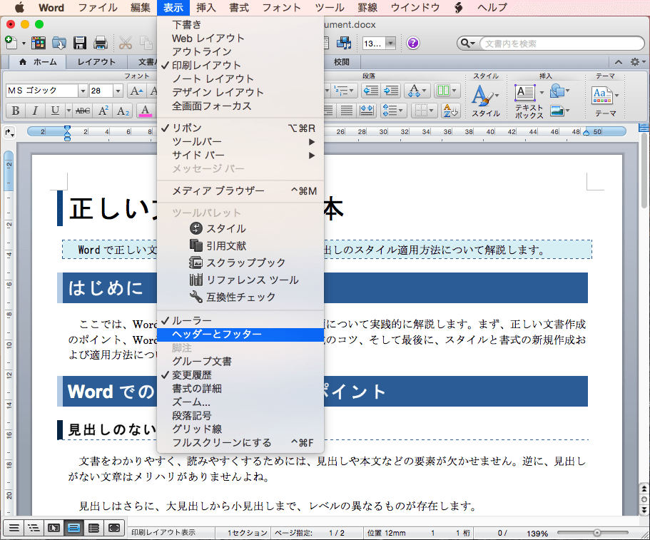 - [表示]メニューの[ヘッダーとフッター]をクリックして[ヘッダーとフッター]画面を表示します。