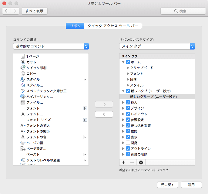 リボンのユーザー設定