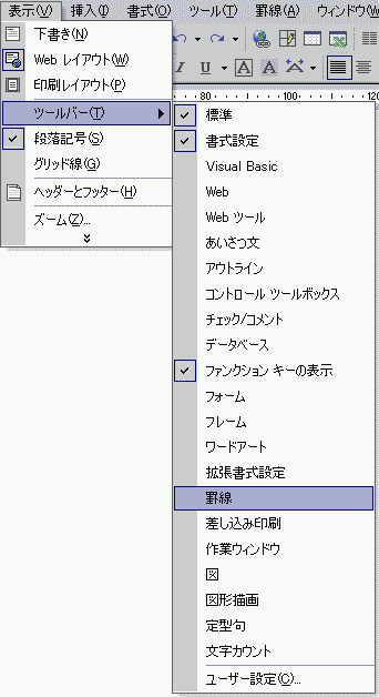 | メニューバーから表示させることもできます。 [表示(V)]→[ツールバー(T)]をポイントしてください。 ツールバーの一覧が表示されます。チェックのついている項目は表示されています。 「罫線」にチェックがついていない場合は、クリックしてチェックしてください。 ![]() 罫線ツールバーが表示されます。 すると、罫線モードとなり、マウスポインタが鉛筆の形に変わります。 |