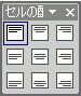 | セルの配置 | ▼をクリックし、セル内の文字列の配置を設定します 両端揃え・中央揃え・右寄せと同時に設定することができます。 ![]() | |