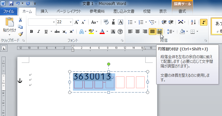 - フィールド全体を選択して、均等割り付けにします。