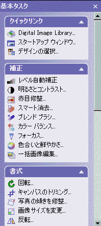 Digital Image Pro でよく使用する機能に簡単にアクセスできます。基本タスクの一覧の表示と非表示を切り替えるには、グラフィック エリア ツール バーの [基本タスク] をクリックします。