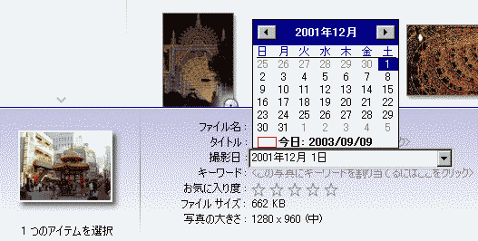 Digital Image Libraryで表示される撮影日は、Exif情報(カメラのメーカー名、モデル、シャッタースピード・・・などカメラの情報)が写真ファイルに記録されていればそれを表示します。