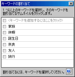 キーワードの割り当てのウィンドウが表示されますので、任意のキーワードを選んで、割り当てたい写真をクリックします。