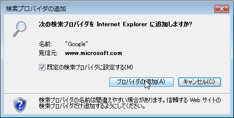- [検索プロバイダの追加]ウィンドウが表示されます。既定の検索プロバイダに設定して追加するには[既定の検索プロバイダに設定する]にチェックを入れて[プロバイダの追加]ボタンをクリックします。