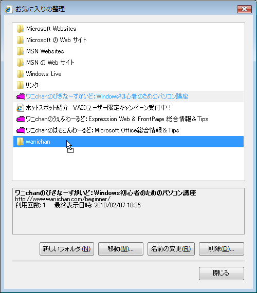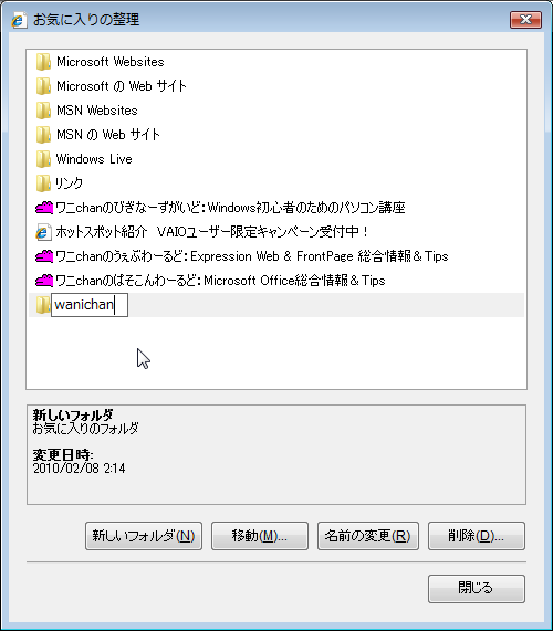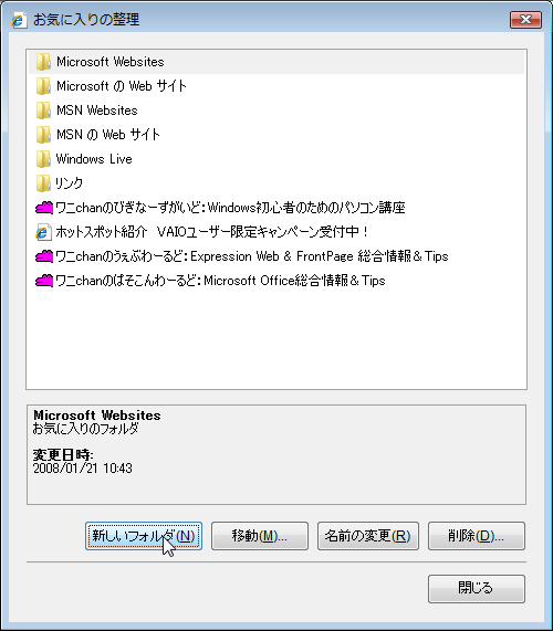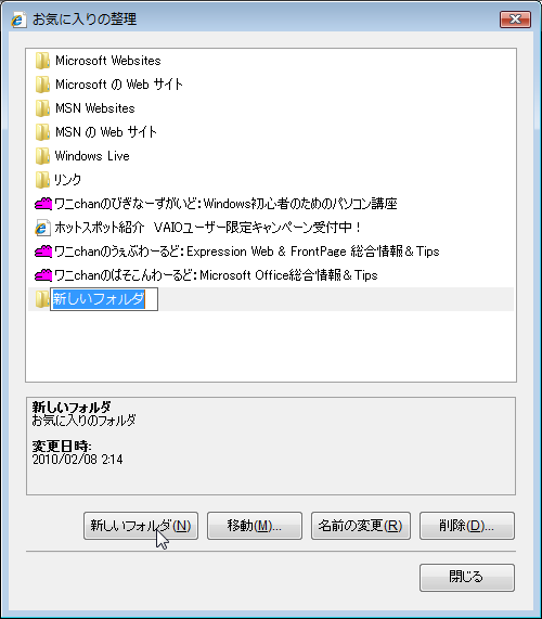 - [お気に入りの整理]ダイアログボックスの[新しいフォルダ]ボタンをクリックします。