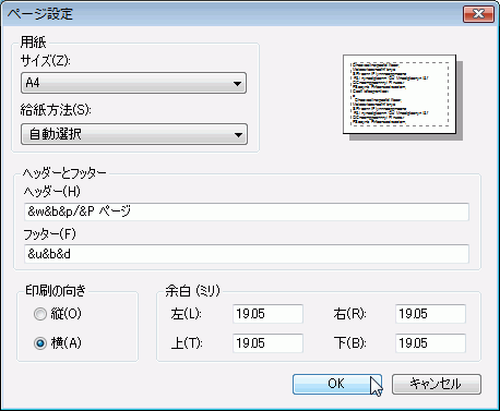 - [ページ設定]ダイアログボックスにて、[印刷の向き]を「横」にして[OK]ボタンをクリックします。