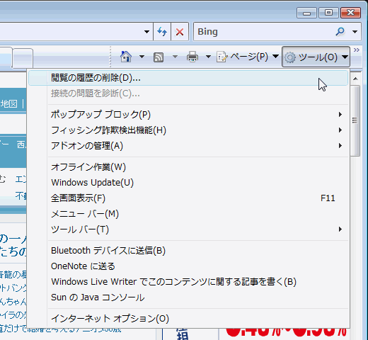 - [ツール]-[閲覧の履歴の削除]をクリックします。