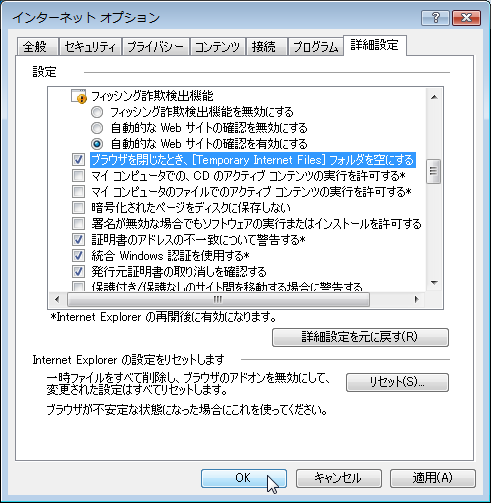 - 「ブラウザを閉じたとき、[Temporary Internet Files] フォルダを空にする]のチェックをつけて[OK]ボタンをクリックします。