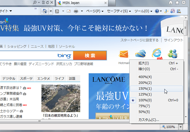 オプションボタン、ステータスバーやコマンドバーを利用してWebページ全体を拡大・縮小ができます。