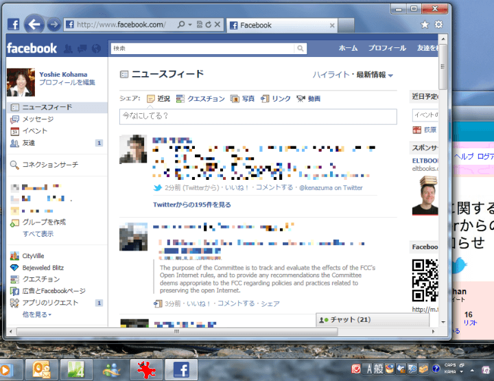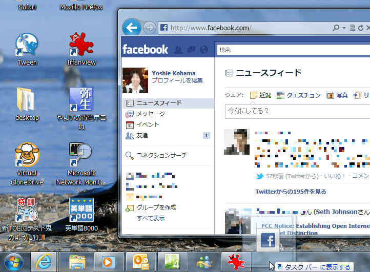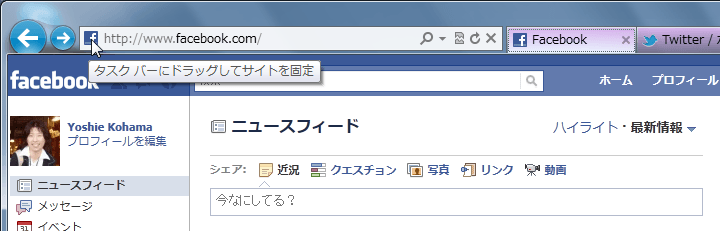 Facebook、twitterやmixiなど、いつも見るWebサイトをすばやく見れるようにするには、タスクバーに固定するとよいでしょう。