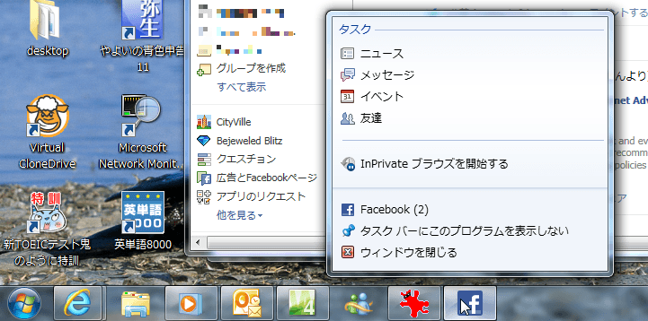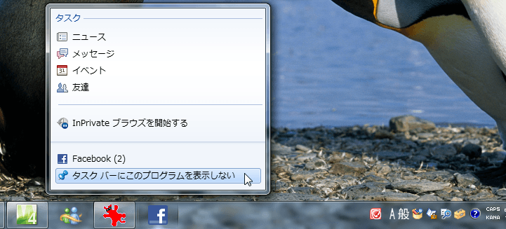 - タスクバーに登録されたFacebookボタンを右クリックすると、タスクメニューが表示されます。