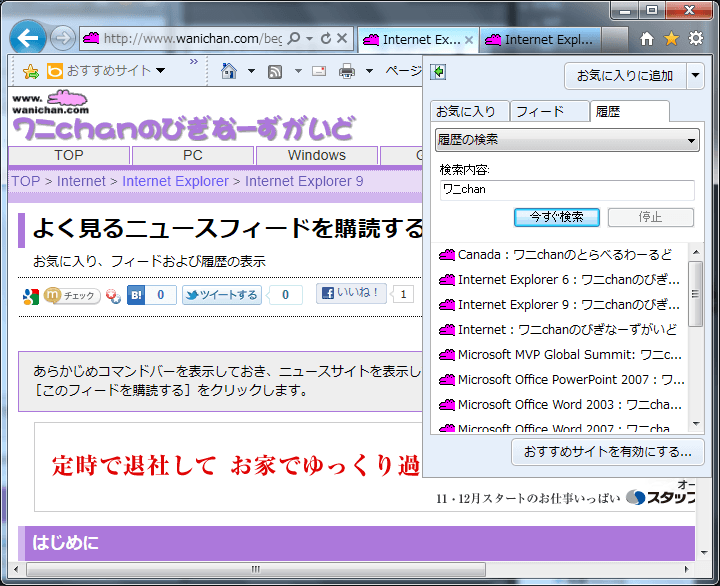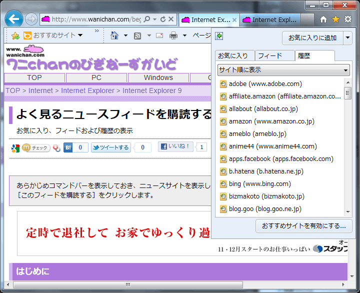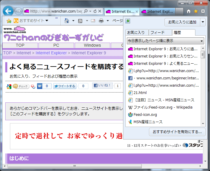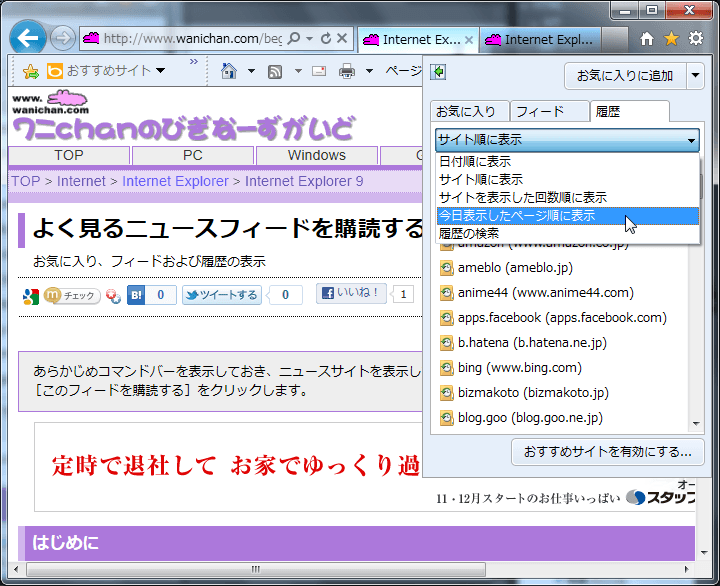 - お気に入りセンターを表示し、[履歴]タブを開きます。