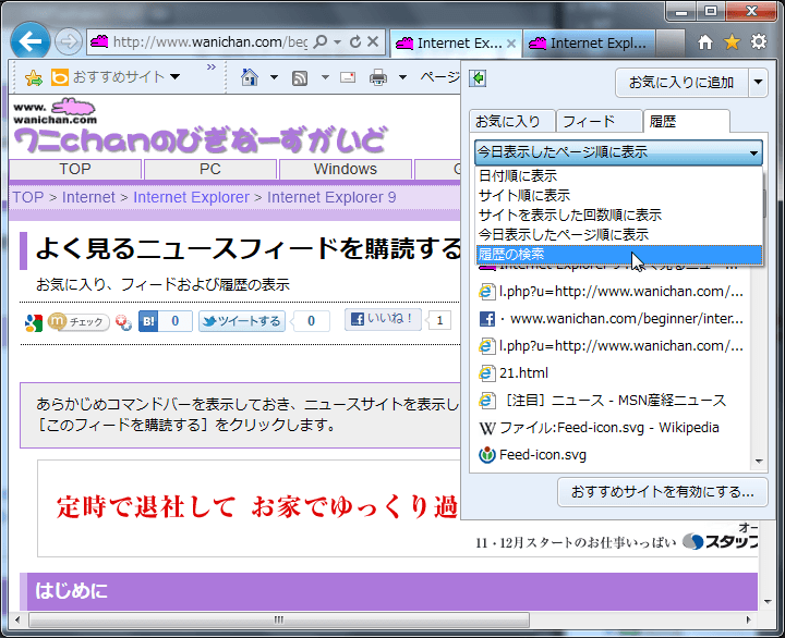 今まで閲覧した履歴を表示するには、お気に入りセンターを表示し、[履歴]タブを開きます。ショートカットキー[Ctrl]+[H]キーでもOKです。履歴の表示方法として「日付順」「サイト順」「サイトを表示した回数順」「今日表示したページ順」の4通りがあり、履歴を検索することも可能です。
