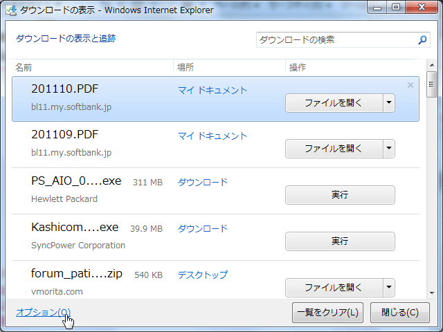 - [ダウンロードの表示]ダイアログボックスの左下の[オプション(O)]をクリックします。