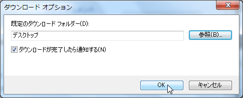 - [ダウンロードオプション]の[既定のダウンロードフォルダー]が変更されたことを確認して[OK]ボタンをクリックします。