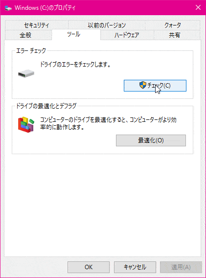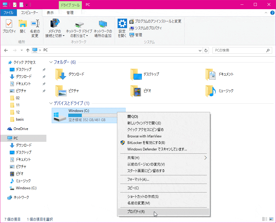 - Cドライブを右クリックしてショートカットメニューより[プロパティ]をクリックします。