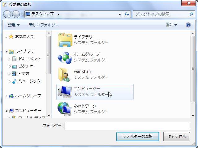 [移動先の選択]画面が表示されたら、[コンピューター]をダブルクリックし、Dドライブを指定して、フォルダーを選択して[フォルダーの選択]ボタンをクリックします。もしフォルダーがない場合は、上の[新しいフォルダー]をクリックして、Documentsと入力してください。