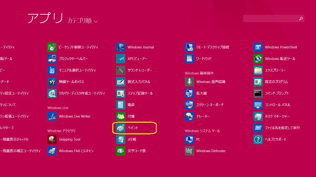アイコンが表示するのでそのアイコンをクリックし、一覧から[ペイント]をクリックします。タッチパネル対応の場合は、スタート画面が表示されたら画面下から上にスワイプすると、アプリ一覧が表示されます。