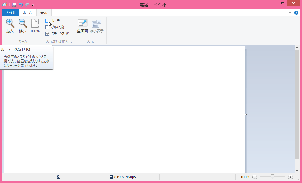 画像内のオブジェクトの大きさを図ったり、位置を揃えたりするためのルーラーを表示するには、[表示]タブを開き、[ルーラー]のチェックボックスにチェックを付けます。ショートカットキーCtrl+Rを使ってもOKです。