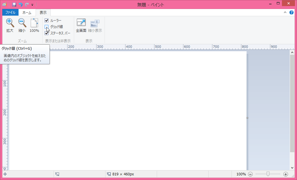 画像内のオブジェクトを揃えるためのグリッド線を表示するには[表示]タブを開き、[グリッド線]のチェックボックスにチェックを付けます。ショートカットキーのCtrl+Gを使ってもOKです。