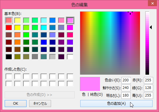 色パレットに希望の色がない場合、独自の色を作成することができます。[ホーム]タブの[色の編集]をクリックし、作成したい色を指定し、[色の追加]ボタンをクリックします。