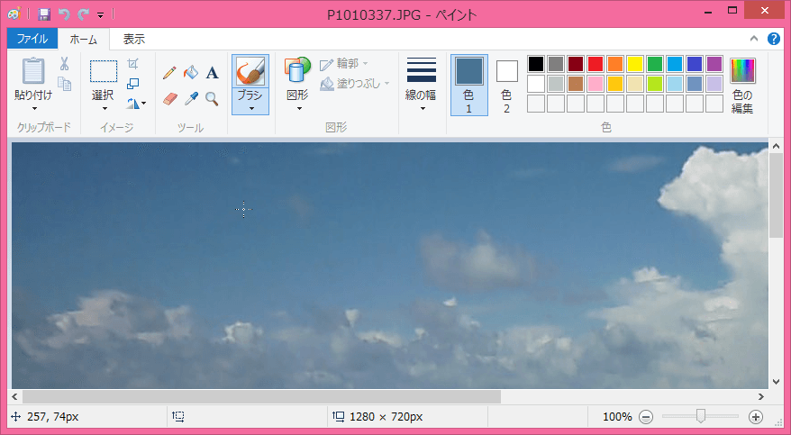 ペイントにはスポイト機能があり、キャンバス上の色を選択することができます。[ホーム]タブの[ツール]グループの[色の選択]をクリックすると、マウスポインターの形がスポイト状になるので、クリックします。