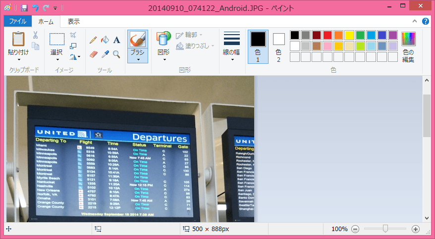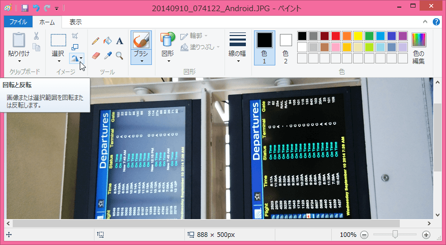 縦向きに撮影した写真が90度回転してしまっている場合、回転方向にしたがって90度回転するとOKです。左に90度回転している場合は、[ホーム]タブの[イメージ]グループの[回転と反転]をクリックし、[右へ90度回転]をクリックします。