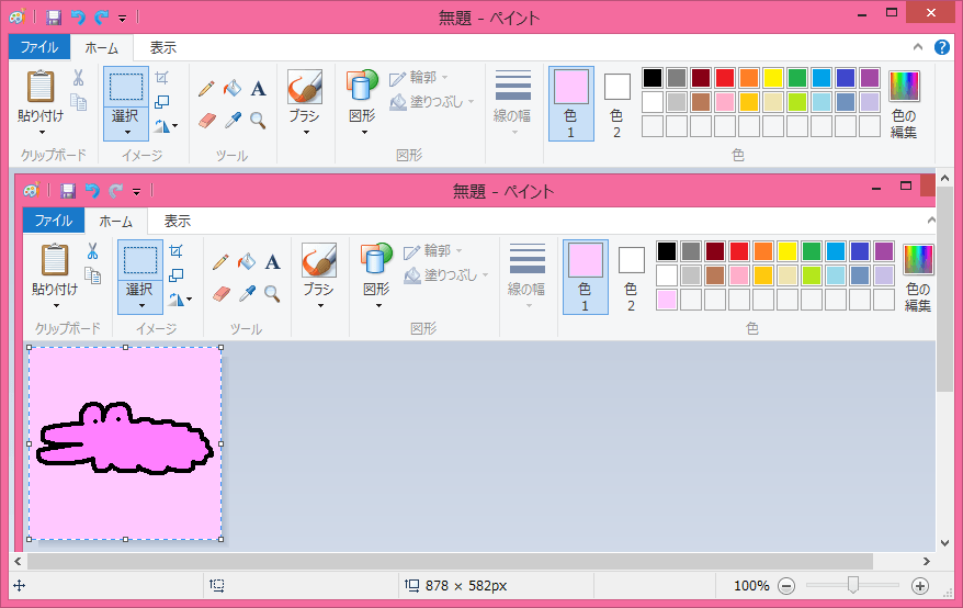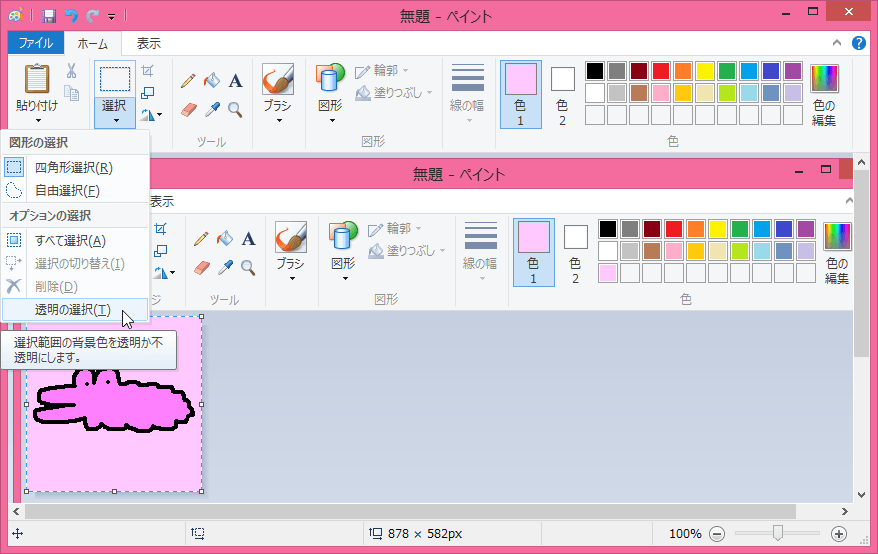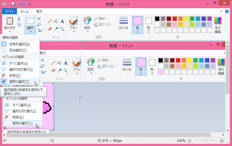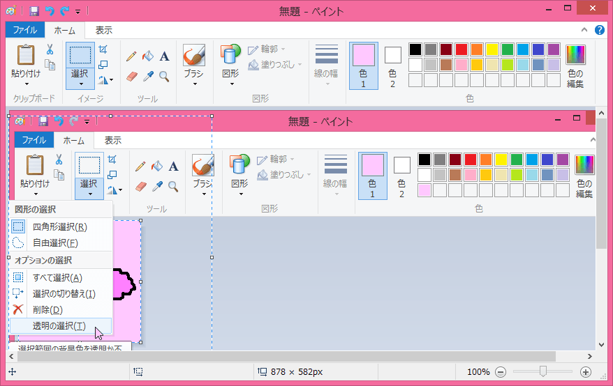 - ペイントに画面を切り替えて、[ホーム]タブの[イメージ]グループの[選択]の▼をクリックして[透明の選択]をクリックします。
