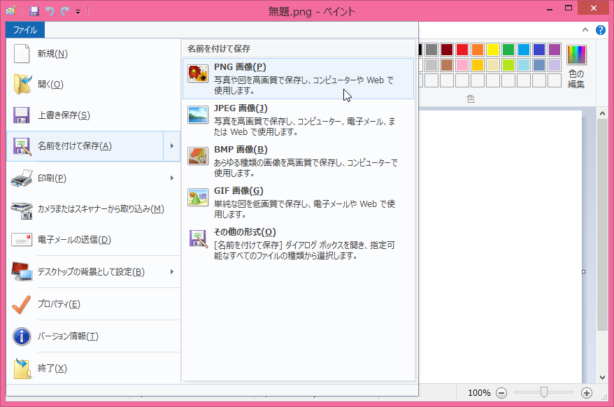 ファイル名が「無題1」等になっている場合は、クイックアクセスツールバーの[上書き保存]ボタン、既存のファイルを編集したけれども別名で保存したい場合は[ファイル]タブを開き、[名前を付けて保存]をポイントしてファイル形式を選択し、ファイル名を指定します。未保存のファイルの場合、既定ではPNG形式で保存されます。