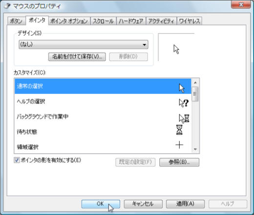 [ポインタ]タブの[デザイン]設定オプションから「なし」を選択すると、Windows XP以前と同じマウスポインタに変更することもできます。