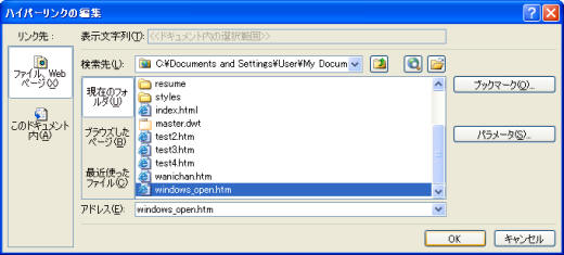 移動先のURLを指定します。[参照]ボタンをクリックして、Webページを選択し、[OK]ボタンをクリックします。[参照]ボタンをクリック