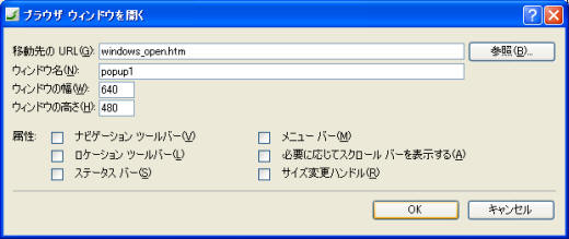 ここでは、ウィンドウ名を「popup1」ウィンドウの幅「640」ウィンドウの高さは「480」に設定します。 - 属性には、どの部分を表示させるか、有効にさせるかを指定します。