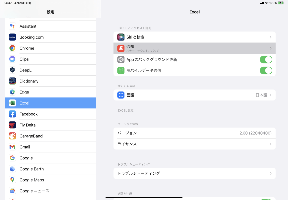 バッジ、サウンド、バナーの通知のExcelへの許可を設定するには、[設定]から[Excel]をタップして、[通知]をタップし、許可する項目のスライダーを右側にスライドにしてオンにして、逆に許可したくない項目のスライダーを左側にスライドします。