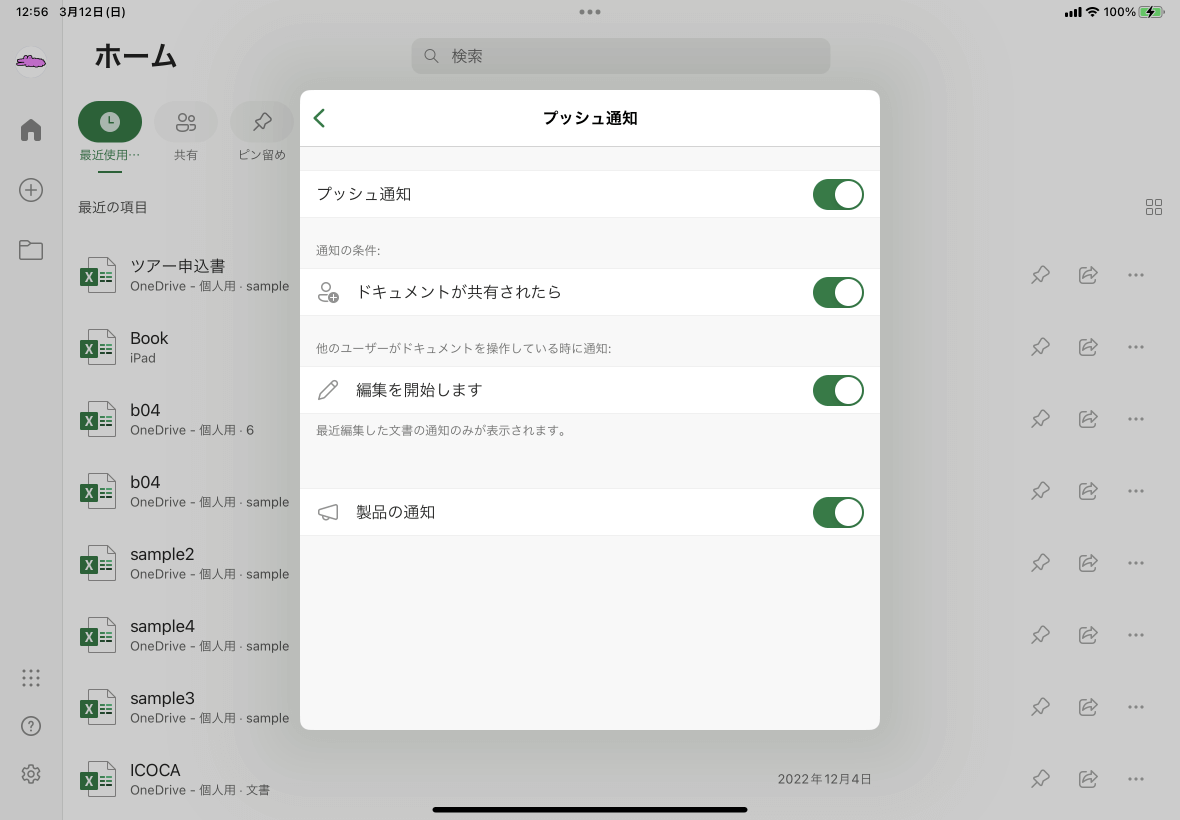 作業中のブックが共有されたとき、他のユーザーが編集を開始したときなどのプッシュ通知は既定ではオンになっています。作業に集中したい場合など煩わしいときは、ホーム画面の左下の