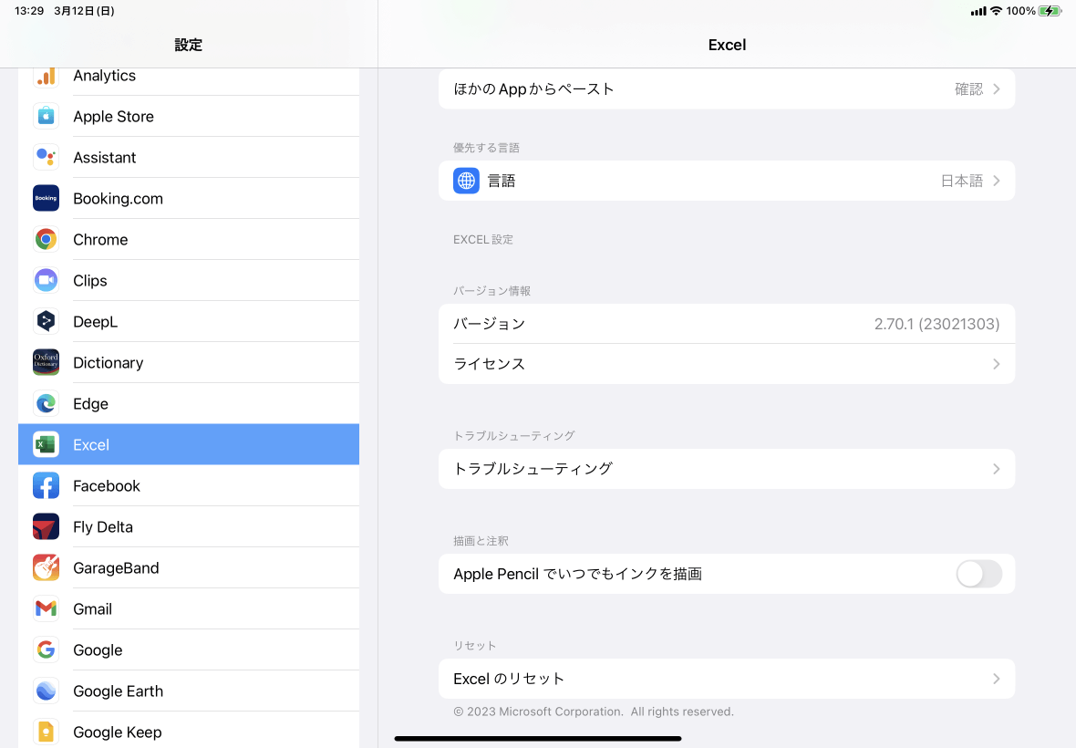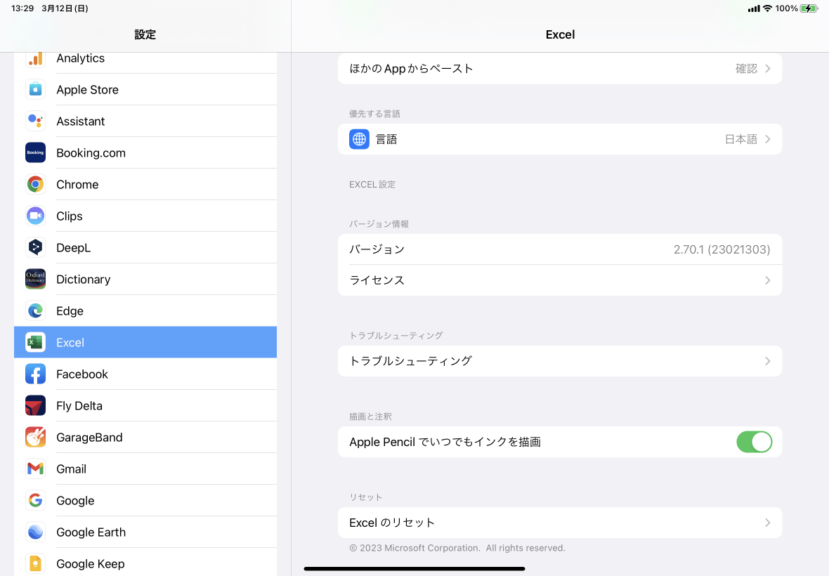 Pencil でいつでもインクを描画]のスイッチをオフにします。[設定]アプリから[Excel]を選んで、[Apple Pencil