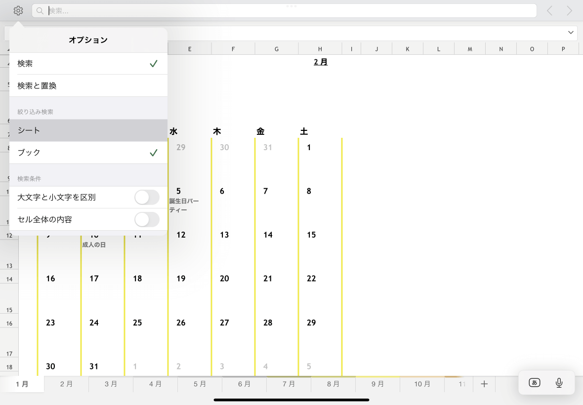 をタップしてから左上の歯車のアイコンをタップして、一覧から[検索する場所]オプションより[シート]が指定されていることを確認し、「ブック」が選択されている場合は「シート」を選択します。
