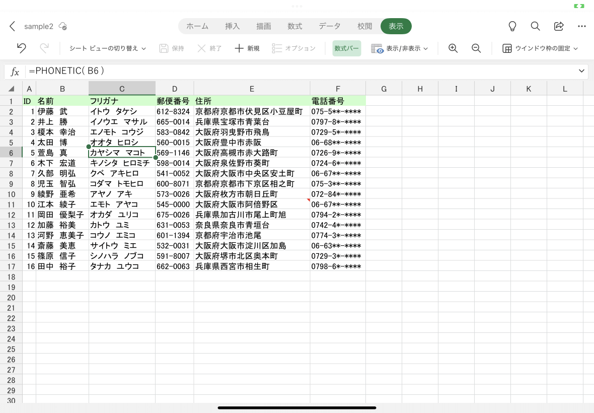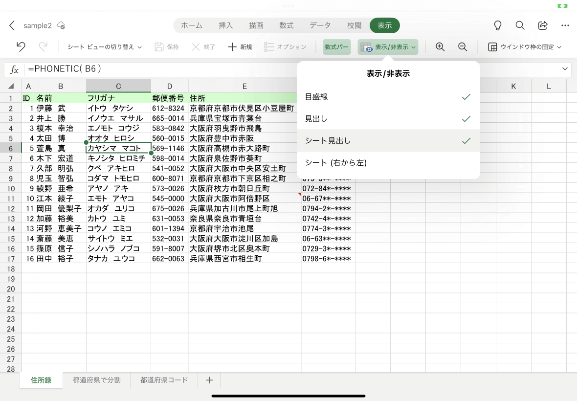 Excel for iPadでシート見出しを非表示にするには、[表示]タブを開き、[表示/非表示]一覧より[シート見出し]のチェックをオフにします。