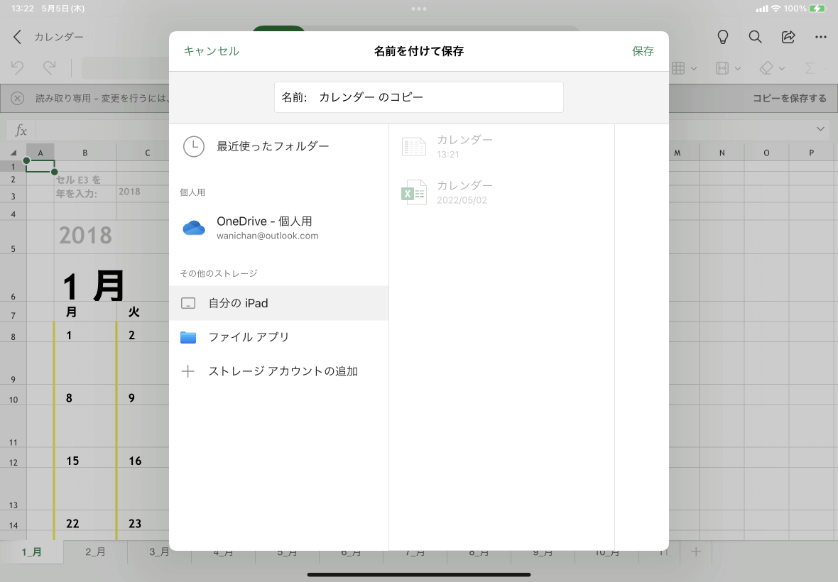 OpenDocumentスプレッドシート形式のブックをExcel for iPadで開くことはできますが、読み取り専用になります。編集するには、Excel形式で保存する必要があります。[コピーを保存する]をタップして、保存先とファイル名を指定します。