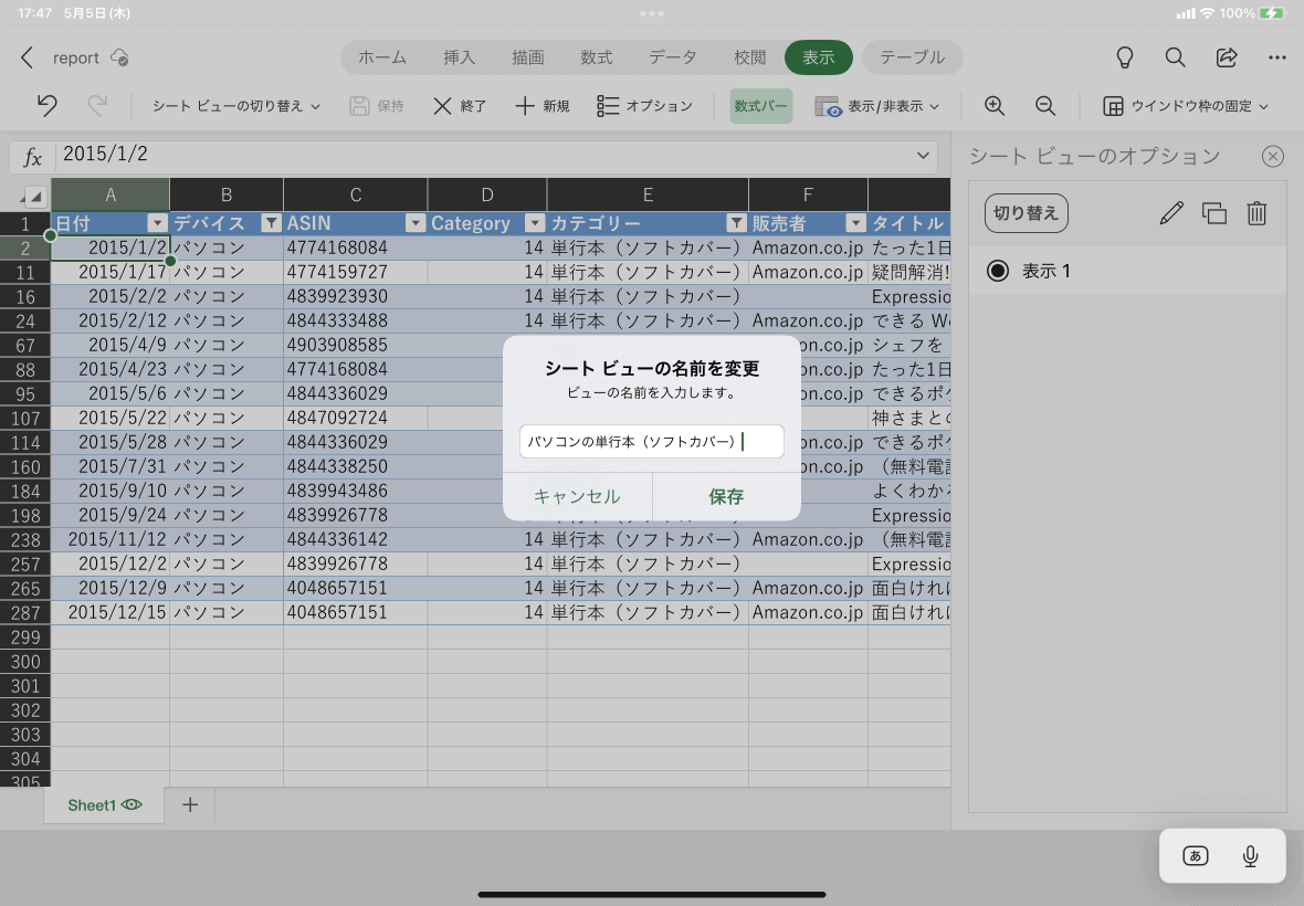 シートビューを閉じて既定のビューに戻る場合は、[表示]タブの[シートビュー]グループの[終了]をタップします。シートビューが未保持の場合は、保持するかどうかのメッセージが表示されます。保持する場合は、シートビューの名前を指定して[保持]ボタンをタップします。