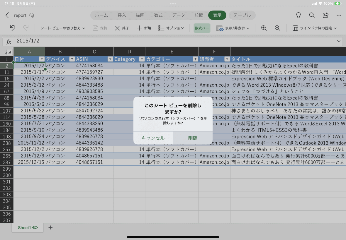 - [シートビューのオプション]ウィンドウから名前を削除したいシートビューを選択して[削除]をタップします。