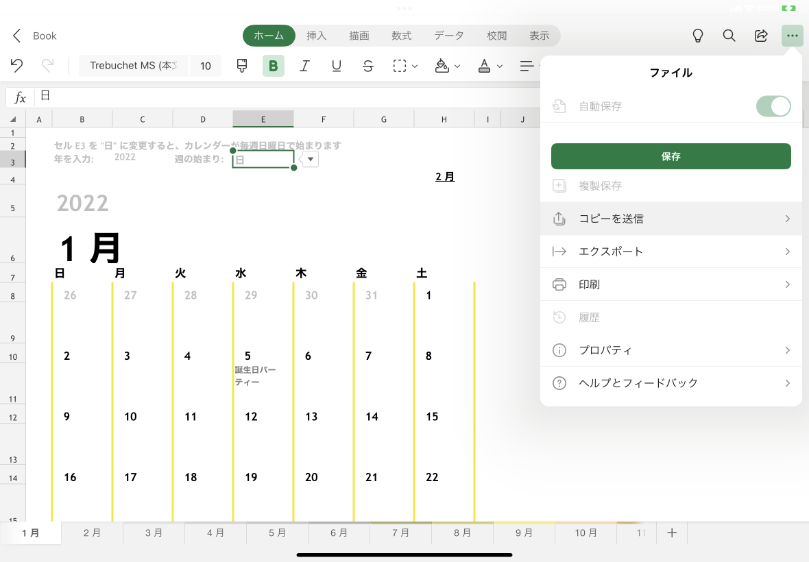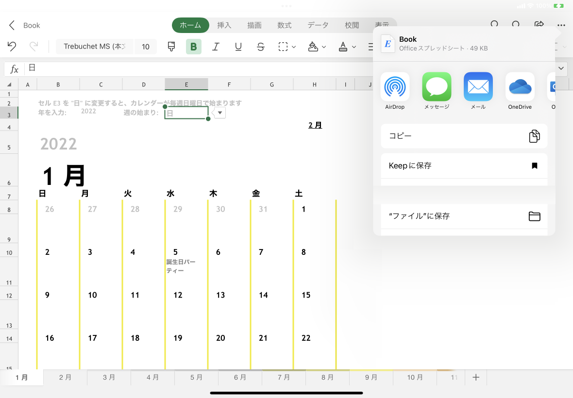 [ファイル]アイコンをタップし、[コピーを送信]を選択して、ファイル形式と送信方法を選択します。この方法では、未保存のブックでもOKです。