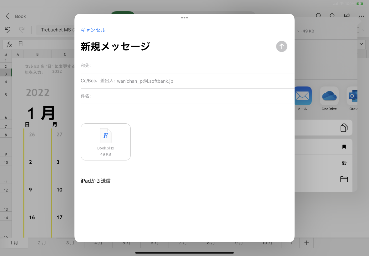 新しいメッセージに作業中のブックのコピーが添付されたことを確認し、宛先や件名等を編集して、右上の[送信]をタップするとOKです。