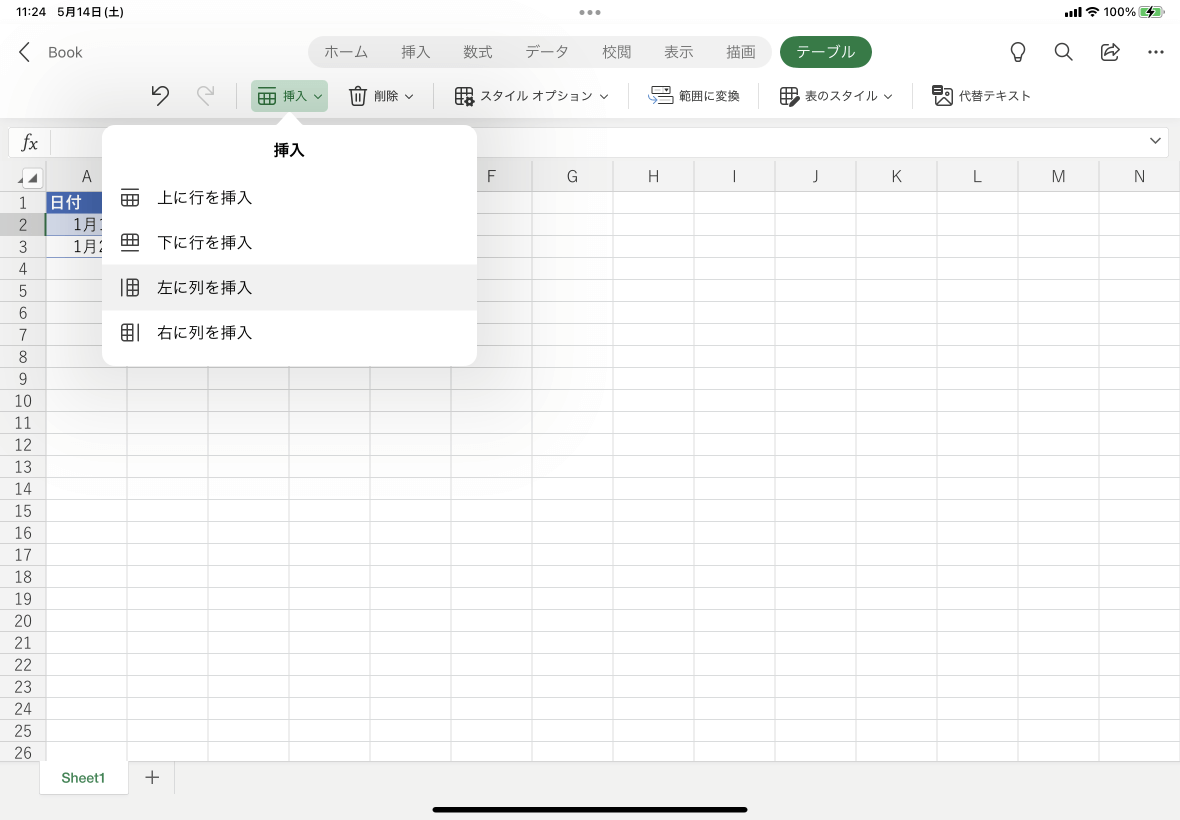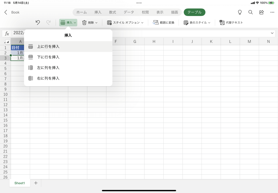 - テーブル内の挿入する行の右の列内の任意のセルを選択して[テーブル]タブの[挿入]をタップします。