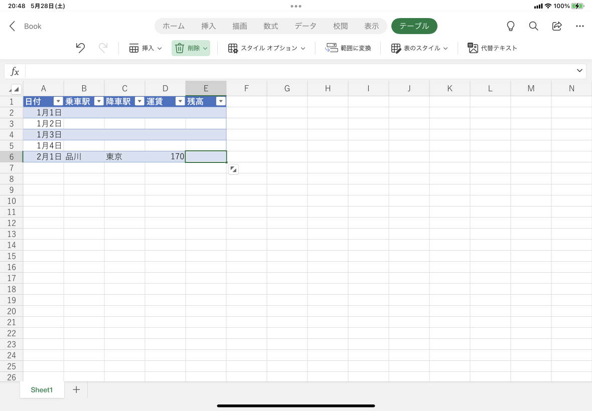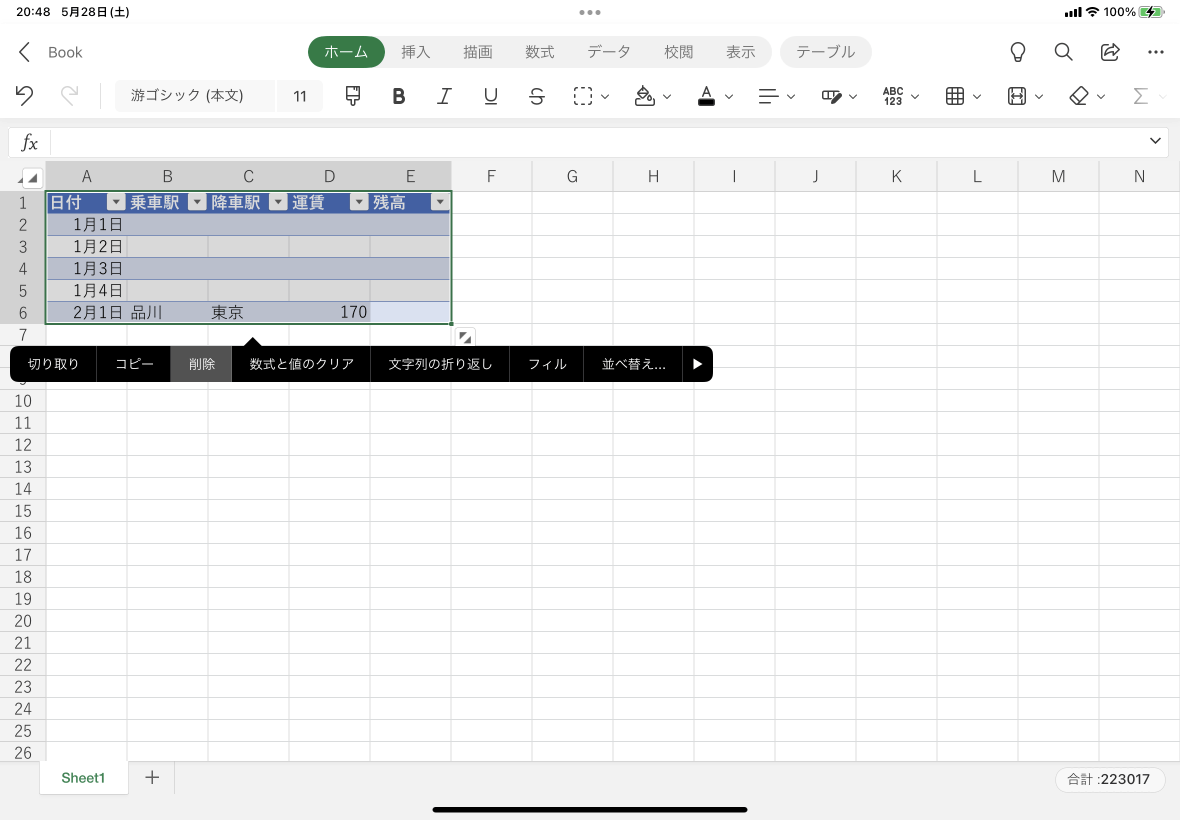 ワークシートからテーブルを削除するには、テーブル全体を選択し、ポップアップメニューから[削除]をタップします。テーブル内にカーソルを移動し、[テーブル]タブの[削除]オプションから[テーブルの削除]を選択してもOKです。