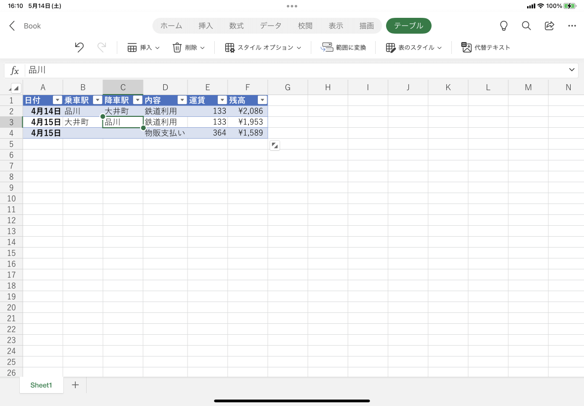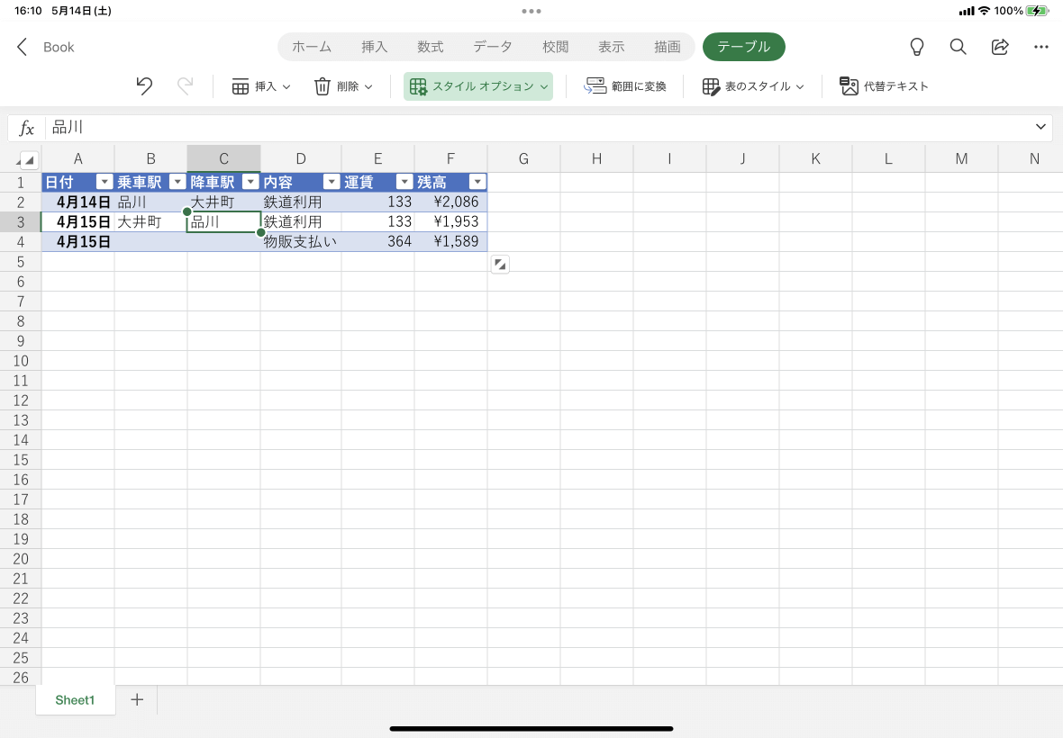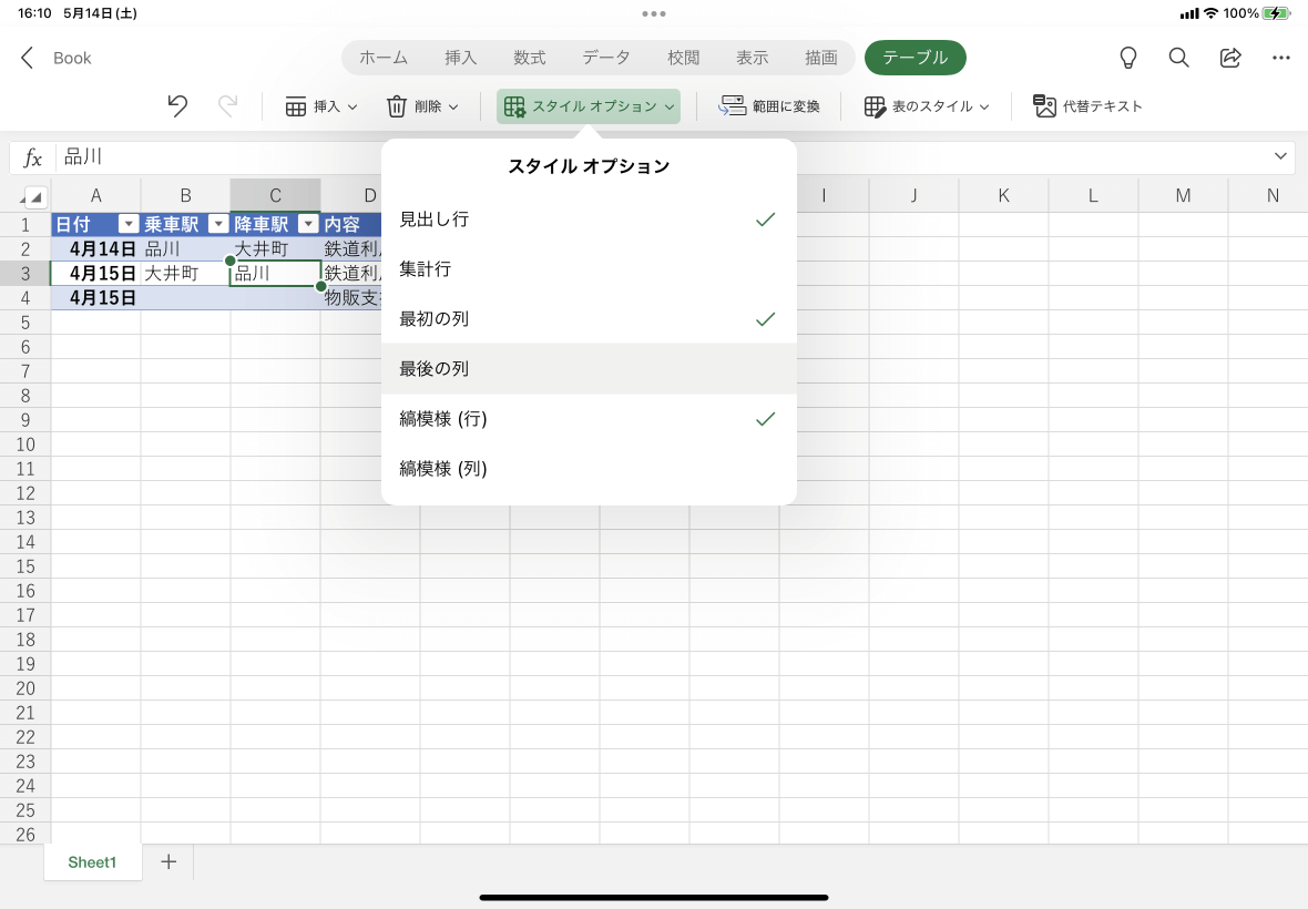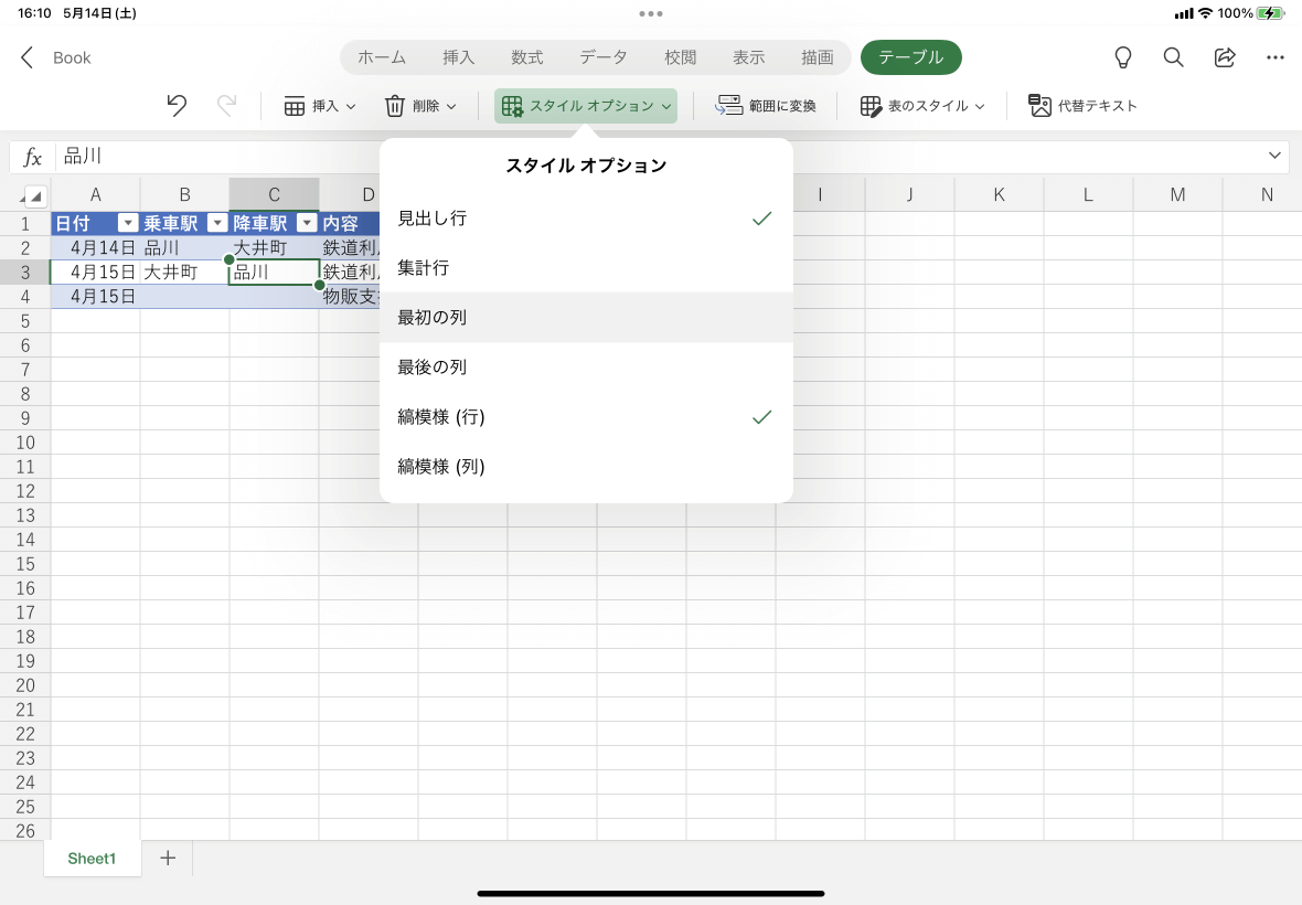Excel for iPadで最初の列や最後の列を見出しスタイルにするには、テーブル内にカーソルを移動して[テーブル]タブを開き、[スタイルオプション]一覧から[最初の列]や[最後の列]にチェックを付けます。