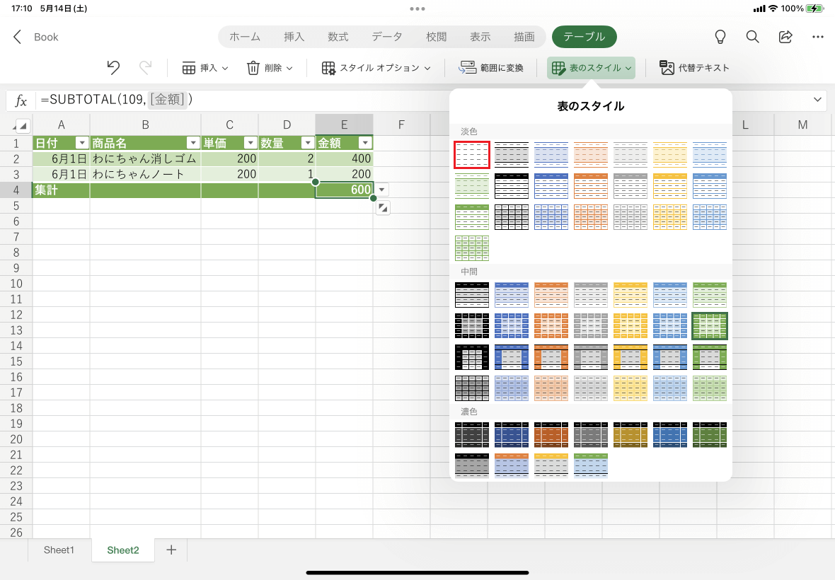- テーブル内をアクティブセルにして[テーブル]タブの[表のスタイル]をタップします。